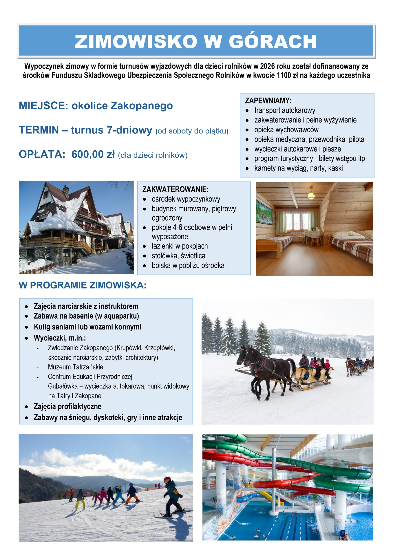 Zapraszamy dzieci rolników z naszej Gminy na 7-dniowe zimowisko w górach, w okolicach Zakopanego!