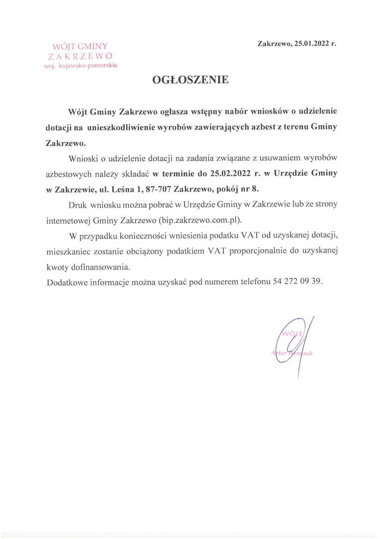Obwieszczenie Wójta Gminy Zakrzewo w sprawie "Programu usuwania...