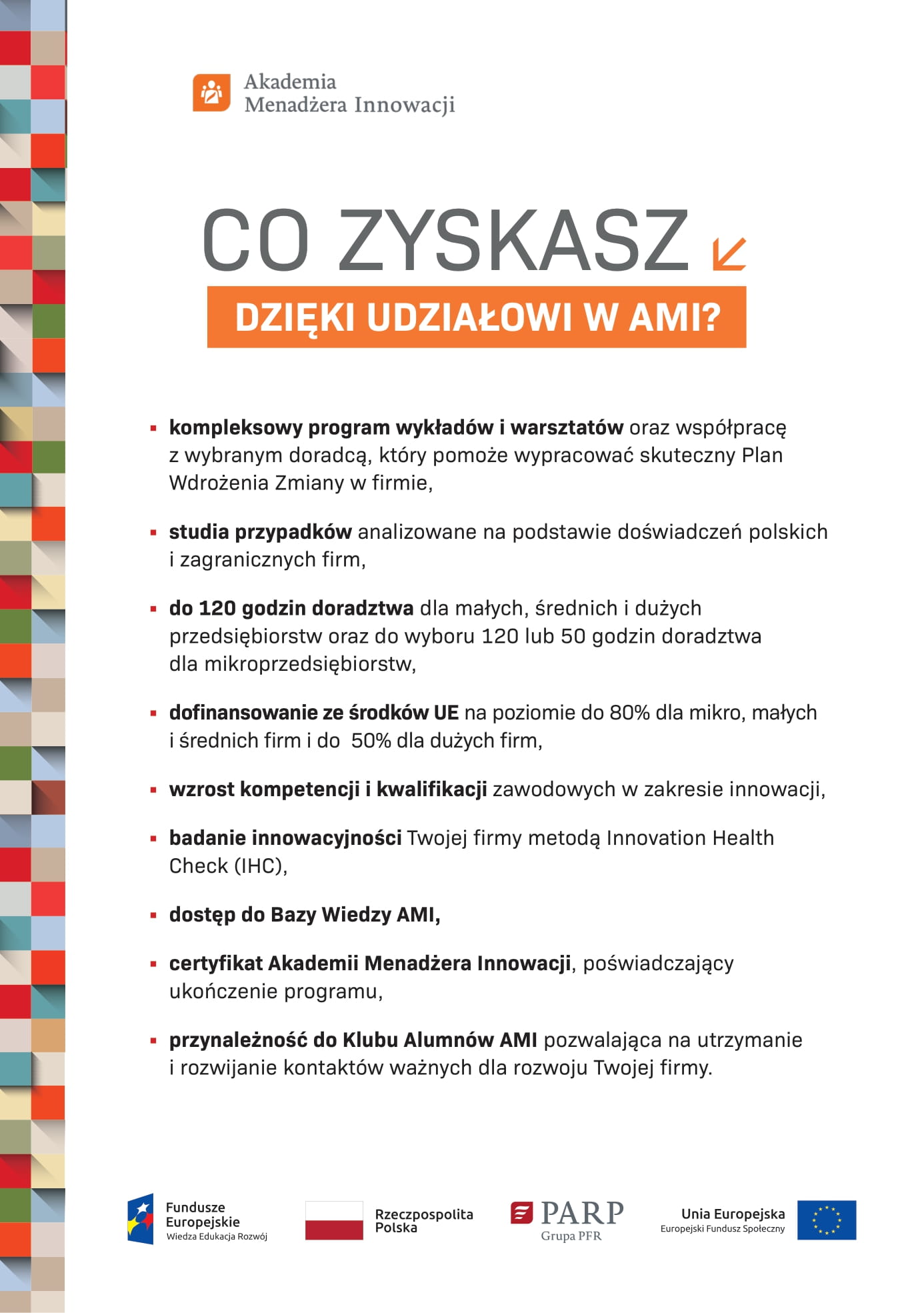 AMI to kompleksowy, autorski program Polskiej Agencji Rozwoju Przedsiębiorczości, obejmujący wykłady i warsztaty oraz współpracę z wybranym doradcą. Wykładowcami, metodykami, warsztatowcami i doradcami AMI są uznani eksperci, praktycy, liderzy i mentorzy z dziedziny wdrażania i zarządzania innowacjami. Celem programu jest zbudowanie w firmie zespołu, który będzie skutecznie działał na rzecz jej rozwoju poprzez innowacje.