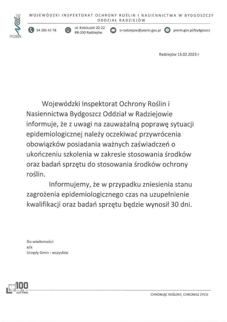Informacja Wojewódzkiego Inspektoratu Ochrony Roślin i Nasiennictwa Bydgoszcz Oddział w Radziejowie.