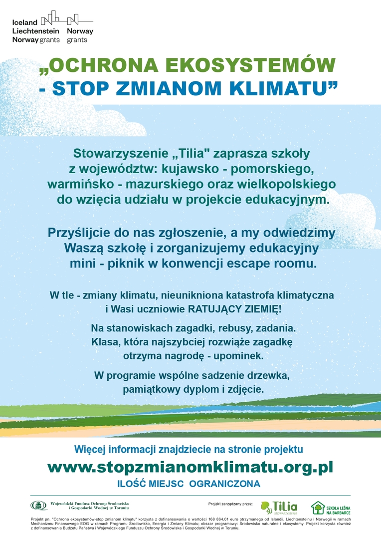 W imieniu Stowarzyszenia „Tilia” chciałabym zaprosić placówki oświatowe do wzięcia udziału w wydarzeniach edukacyjno - informacyjnych tzw. mini piknikach, które organizowane są w ramach projektu pn. „Ochrona ekosystemów - stop zmianom klimatu”.