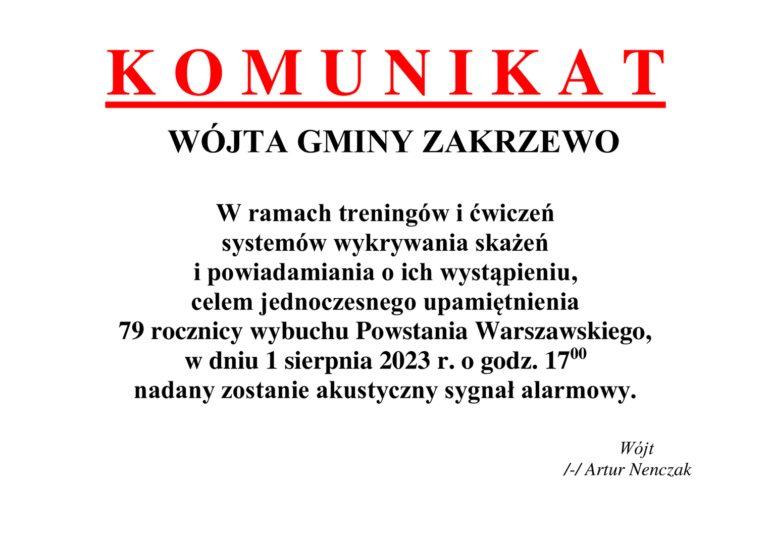 Komunikat o użyciu sygnałów alarmowych z okazji 1 sierpnia