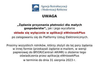 W przypadku składania wniosku przez platformę ePUAP lub mObywatel, aby wniosek trafił do biura powiatowego Agencji właściwego ze względu na miejsce zamieszkania albo siedzibę wnioskodawcy należy starannie wskazać dane tej jednostki, tj. w nazwie jednostki musi występować określenie „Biuro powiatowe” oraz nazwa powiatu gdzie dane BP ARiMR ma siedzibę, np. „BIURO POWIATOWE AGENCJI RESTRUKTURYZACJI I MODERNIZACJI ROLNICTWA W ZAMOŚCIU (22-400 ZAMOŚĆ, WOJ. LUBELSKIE)” lub „AGENCJA RESTRUKTURYZACJI I MODERNIZACJI ROLNICTWA - BIURO POWIATOWE (65-120 ZIELONA GÓRA, WOJ. LUBUSKIE)”.
