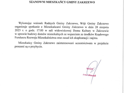 Informacja o spotkaniu z Mieszkańcami Gminy Zakrzewo