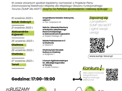Przypominamy, że do 30 września można też wziąć udział w konkursie fotograficznym, pod hasłem „„Mobilność w Miejskim Obszarze Funkcjonalnym Torunia”.
