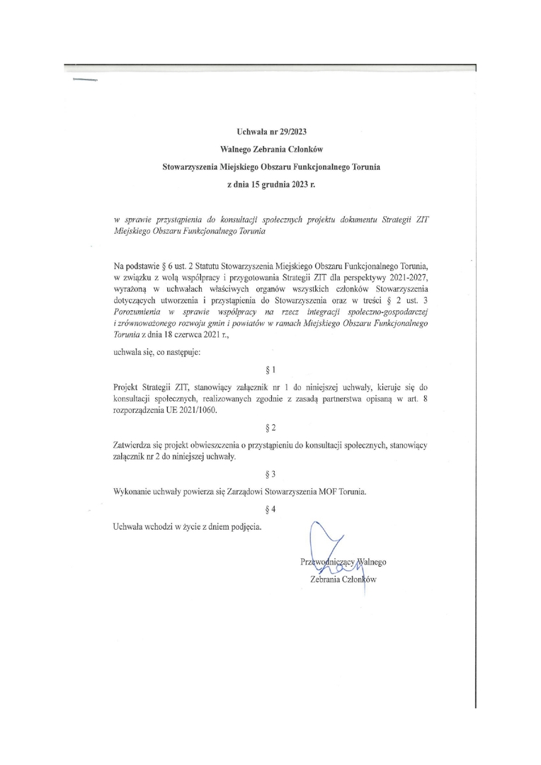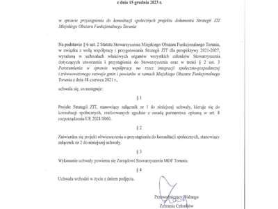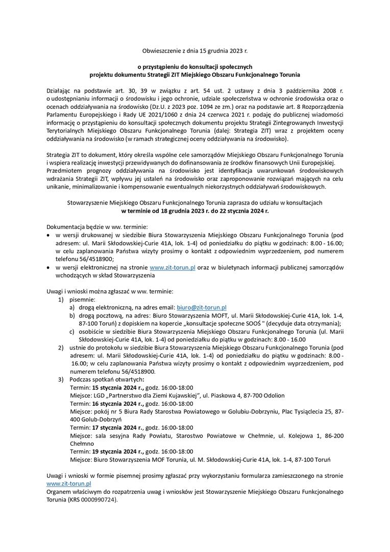 Działając na podstawie art. 30, 39 w związku z art. 54 ust. 2 ustawy z dnia 3 października 2008 r. o udostępnianiu informacji o środowisku i jego ochronie, udziale społeczeństwa w ochronie środowiska oraz o ocenach oddziaływania na środowisko (Dz.U. z 2023 poz. 1094 ze zm.) oraz na podstawie art. 8 Rozporządzenia Parlamentu Europejskiego i Rady UE 2021/1060 z dnia 24 czerwca 2021 r. podaję do publicznej wiadomości informację o przystąpieniu do konsultacji społecznych dokumentu projektu Strategii Zintegrowanych Inwestycji Terytorialnych Miejskiego Obszaru Funkcjonalnego Torunia (dalej: Strategia ZIT) wraz z projektem oceny oddziaływania na środowisko (w ramach strategicznej oceny oddziaływania na środowisko).