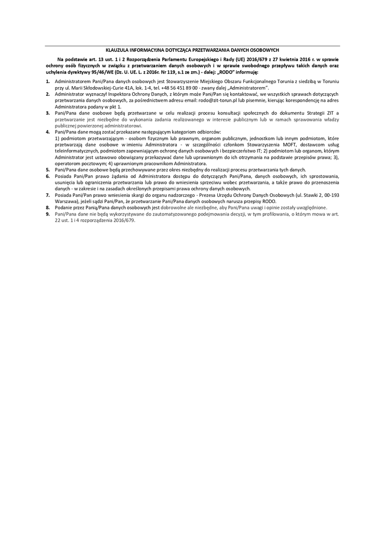 Uwagi i wnioski w formie pisemnej prosimy zgłaszać przy wykorzystaniu formularza zamieszczonego na stronie www.zit-torun.pl